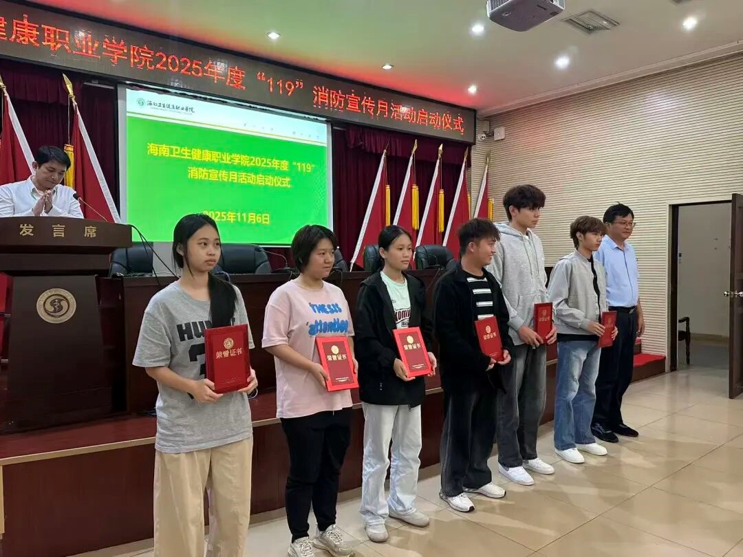 筑牢安全防线,守护平安校园。11月6日下午,我校2025年度“119”消防宣传月启动仪式在秀华校区护理实训楼107报告厅隆重举行。本次活动以“全民消防、生命至上——安全用火用电”为主题,旨在全面提升师生的消防安全素养与应急自救能力。学校副校长高胜利出席并讲话,秀英消防救援站站长,学工处、后资处、安保处负责人、全体辅导员、新入职教师及学生代表共同参与。