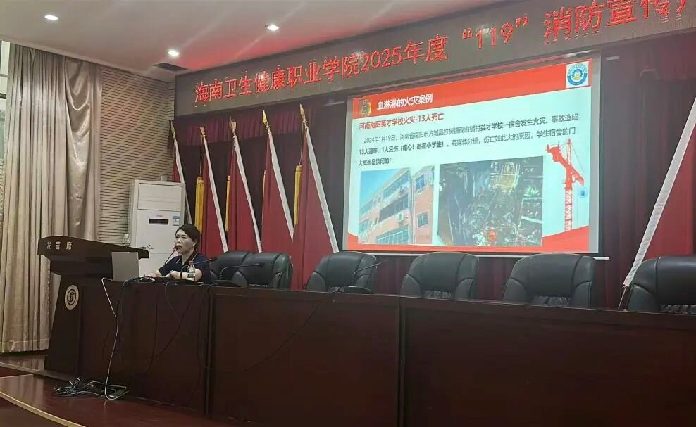 活动的第二阶段,一场贴近校园生活的消防安全知识专题讲座如期举行。本次讲座特邀海南本岛职业培训学校的陈新老师担任主讲。陈老师围绕宿舍用电安全、电动自行车火灾防范、灭火器使用方法及火场逃生技巧等核心内容,进行了系统而深入的讲解,为在场师生带来了一堂干货满满、生动实用的安全必修课。