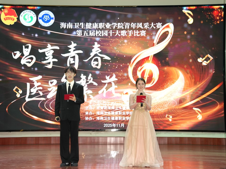 歌声礼赞青春,旋律唱响初心。为深入推进校园文化建设,落实立德树人根本任务,丰富青年学子精神文化生活,充分展现我校青年朝气蓬勃、奋发向上的精神风貌,2025年 11月13日,海南卫生健康职业学院青年风采大赛暨第五届校园十大歌手总决赛在全校师生的热切期盼中热力启幕、完美收官。本次赛事不仅为青年学子搭建了展示才华、追逐梦想的优质平台,更以文化人、以美育人,为培育德智体美劳全面发展的卫生健康专业人才注入了强劲动力。