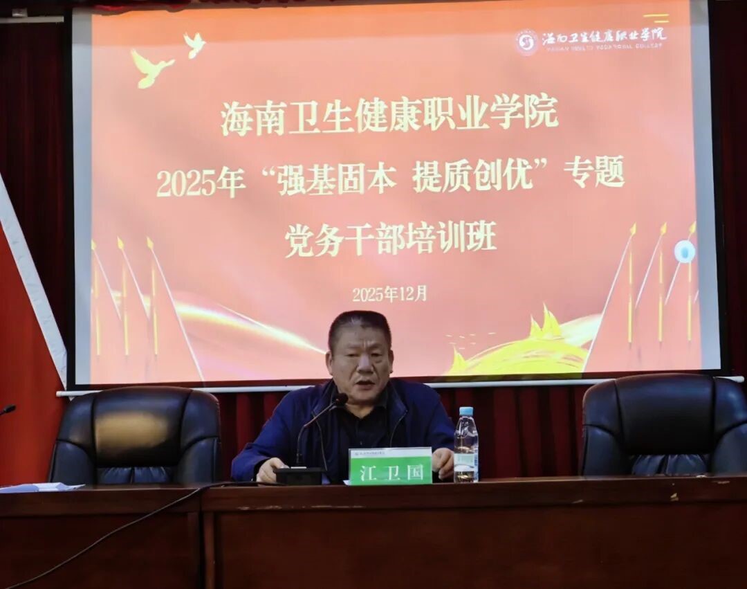 12月6日上午,培训班举行开班仪式。学校党委副书记江卫国出席并作动员讲话。学校党委副书记江卫国在动员讲话中指出,在“十五五”规划开局与学校事业高质量发展的关键时期,此次覆盖全体基层党务干部的专题培训在学校历史上尚属首次,这体现了学校党委对基层党建工作的高度重视。他强调,全体学员要提高站位,深刻认识培训是提升政治能力、服务学校发展的迫切需要;要全情投入,在深思、精学、实干上下功夫,确保学有所获、学以致用;要严守纪律,弘扬优良学风,以过硬作风展现基层党务干部良好形象,努力将学习成效转化为推动学校建设“海南特色、国内一流”办学目标和助力海南自由贸易港建设的实际成果。