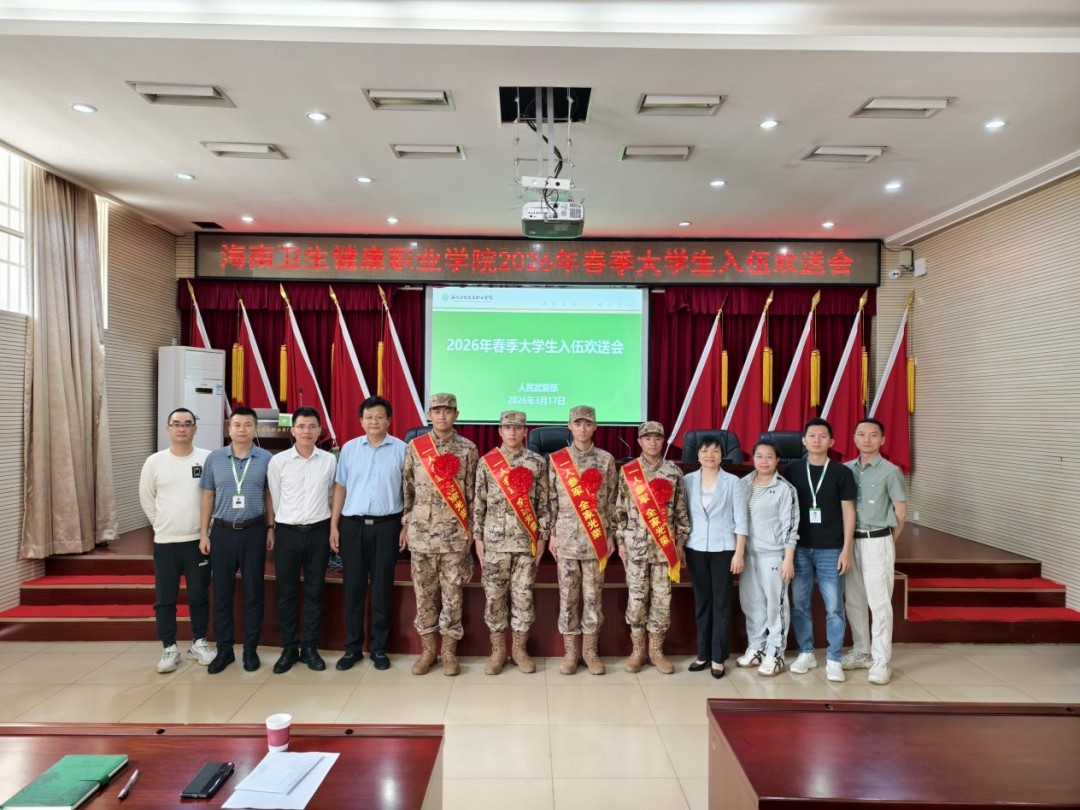 3月17日上午,海南卫生健康职业学院在护理实训楼107室隆重举行2026年春季大学生入伍欢送会,欢送4名优秀学子即将告别校园、奔赴军营,开启光荣的军旅生涯。学校党委书记钟文菲、副校长高胜利出席欢送会,武装部、学工部负责人,各系部党总支书记、学生党支部书记及师生代表共同参加。