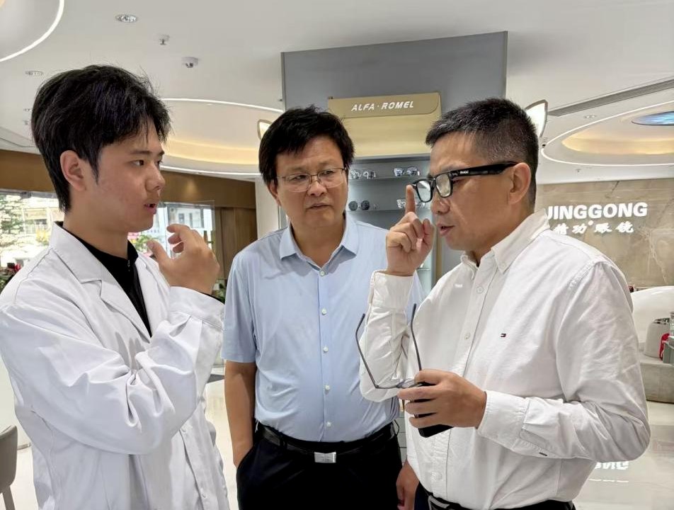 参访团一行实地走访了精功眼镜龙湖眼科诊所,了解门店运营、生产销售及人员配置情况,现场体验智能眼镜与专业验光服务,并与在该门店就职的我校毕业生交流,了解他们的工作适应情况及职业发展收获。