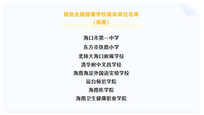 2023年5月8日,教育部公示首批全国健康学校建设单位,我校成为全国1076所健康学校建设单位之一,也是海南省获此殊荣的三所高校之一。